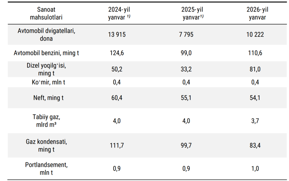Ўзбекистонда 2026 йил январь ойида газ ва нефть қазиб олиш қисқарди. Қолган аксар саноат маҳсулотлари ишлаб чиқаришда ўсиш кузатилди. Бу ҳақдаги рақамлар Статистика қўмитаси эълон қилган навбатдаги ҳисоботда келтирилган