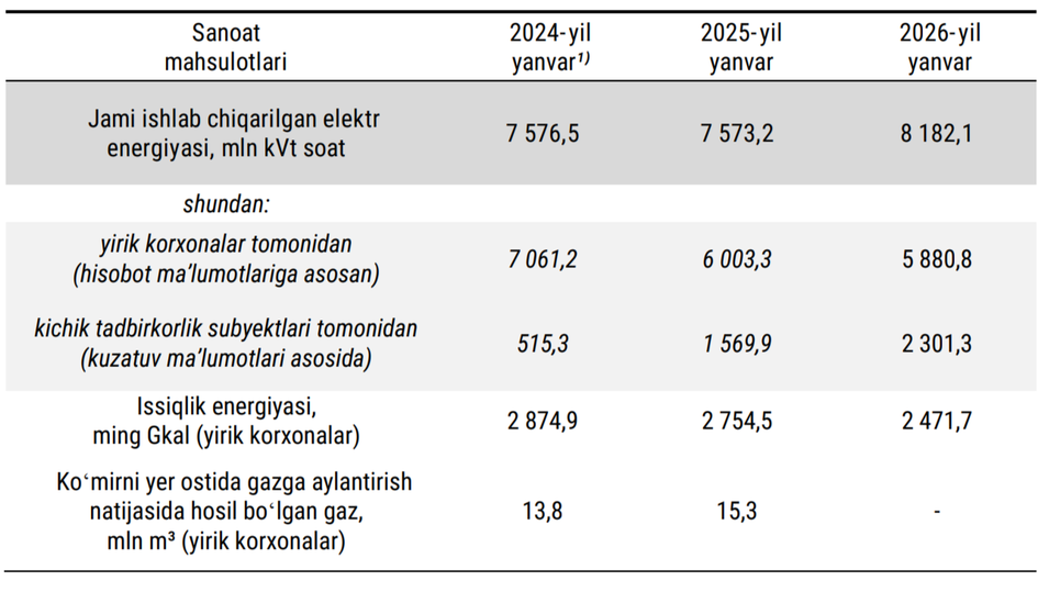 Газдан фарқли равишда электр энергияси ишлаб чиқариш ҳажмида ўсиш кузатилган. Жорий йилнинг илк ойида мамлакатда 8,2 млрд кВт соат электр токи генерация қилинган (2025 йил январида 7,6 млрд кВт соат). Ой давомида нефть қазиб олиш ҳажми минг тоннага камайиб (1,8 фоиз), жами 54,1 тоннани ташкил этган.